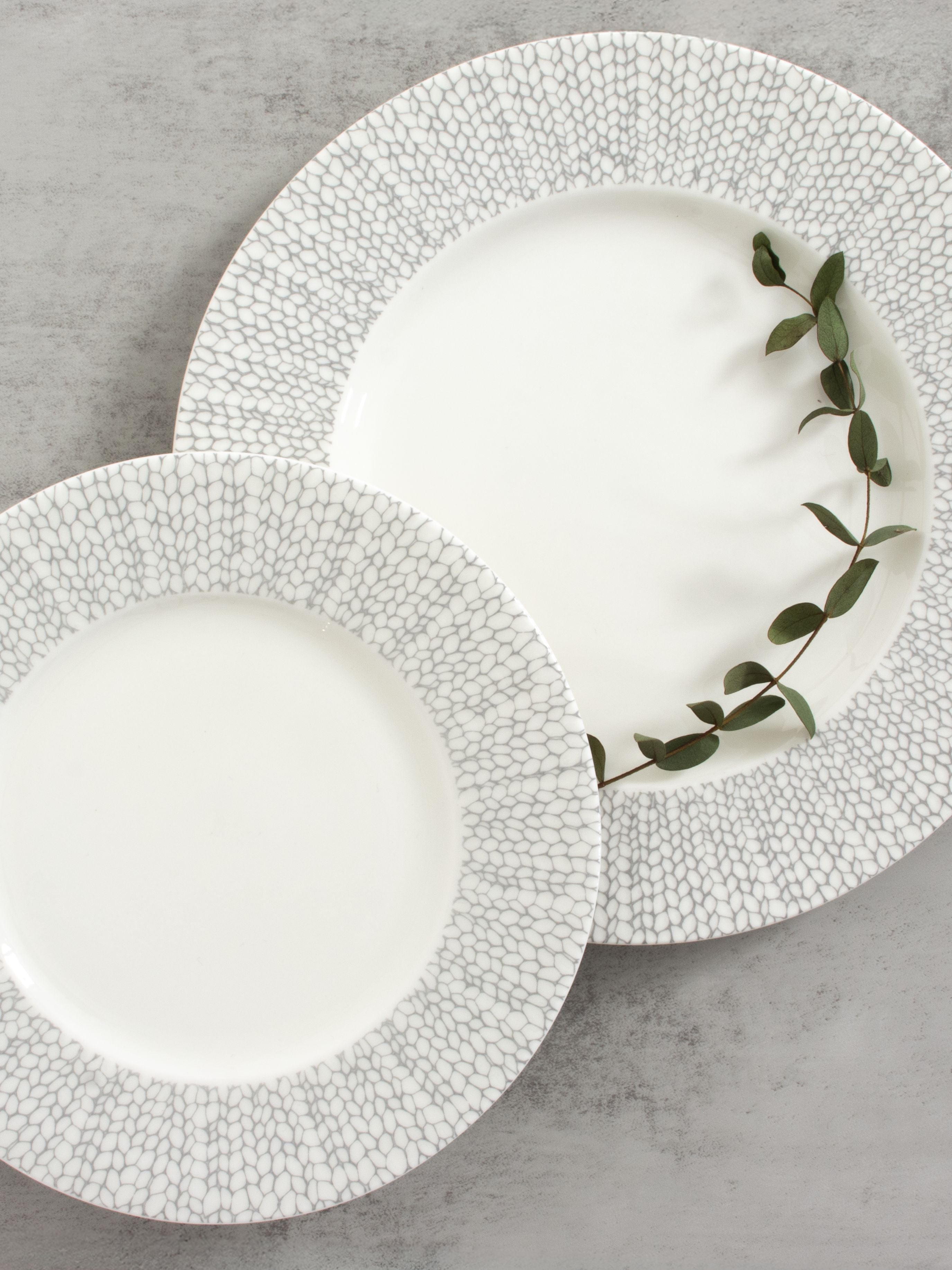 The Lynx collection combines bold geometry with refined accents, featuring a striking lattice-patterned rim in soft gray framed by two elegant gold bands. The result is a modern yet timeless design that adds both texture and sophistication to any table setting.