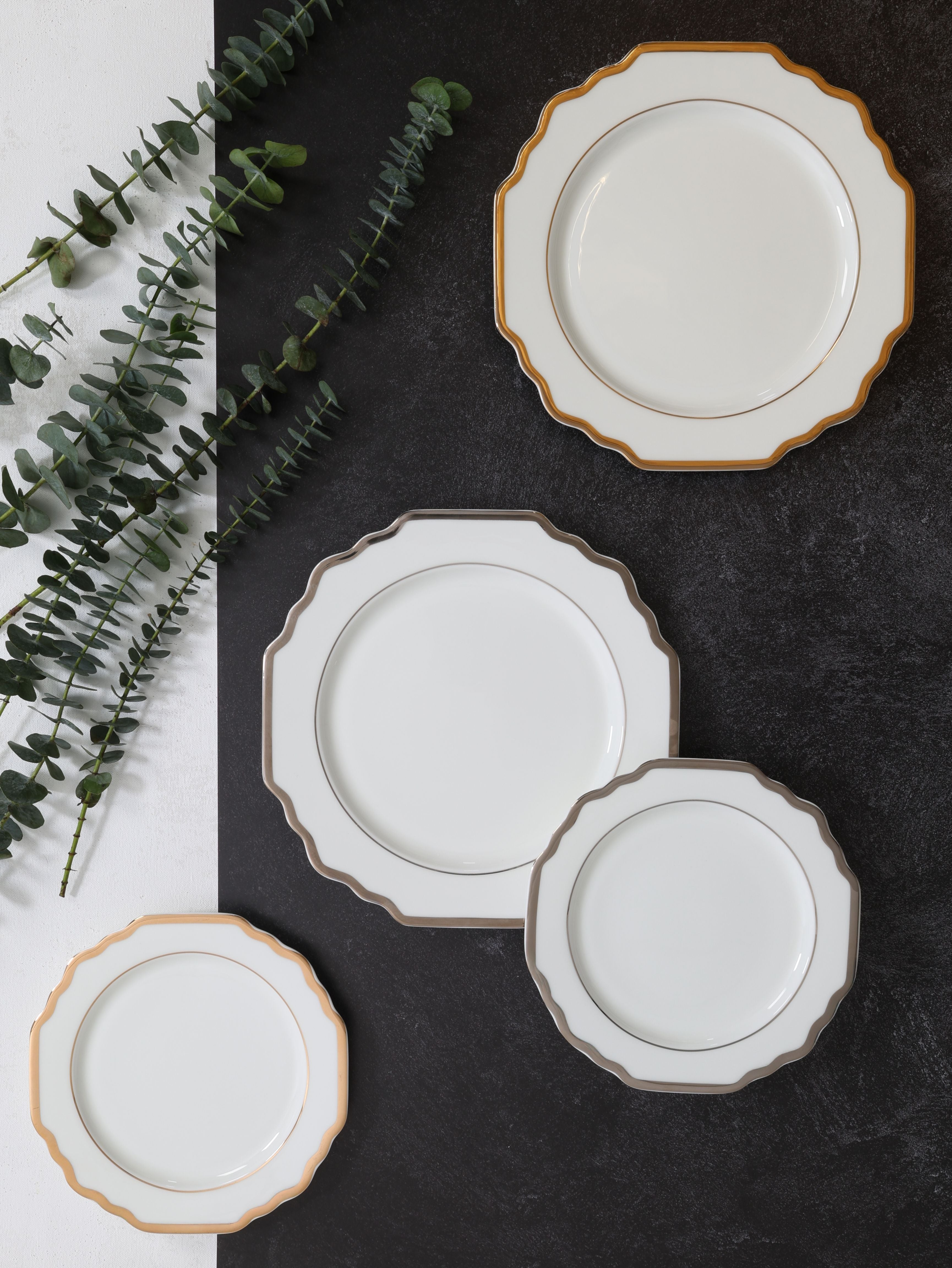 These coupe plates feature a clean white body with a refined metallic edge, blending timeless elegance with a modern, minimal silhouette. Available in both gold and silver rims, the Tavola Coupe collection offers a versatile foundation for upscale table settings, whether you prefer the warmth of gold or the cool sophistication of silver.