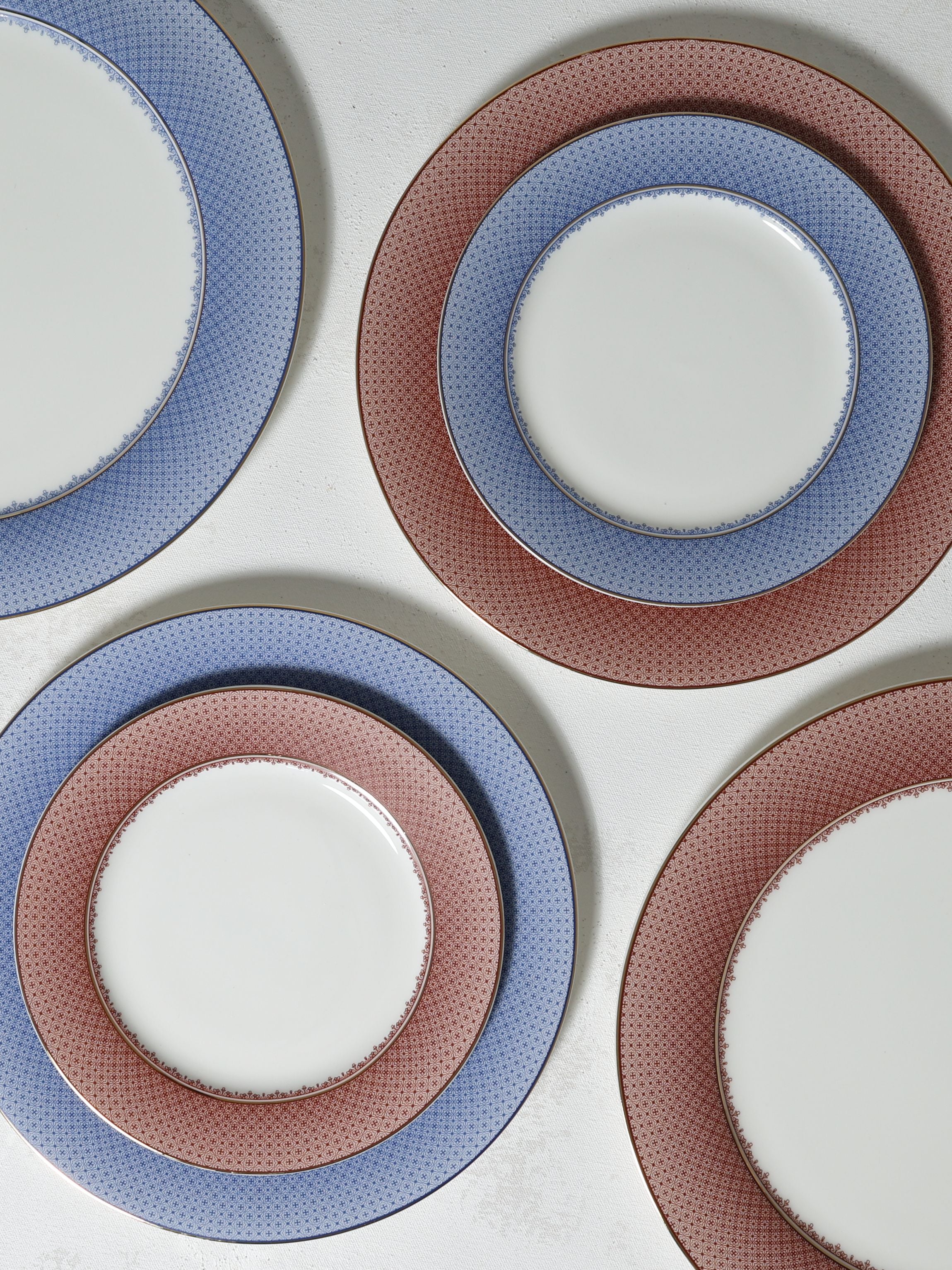 The Celeste Collection balances refinement with charm, featuring two variations that suit distinct moods. The Autumn version pairs a warm russet-toned geometric pattern with a fine golden rim, bringing richness and depth to the table, while the Blue edition softens the look with delicate sky-toned detailing edged in gold, offering a cooler, more serene take.