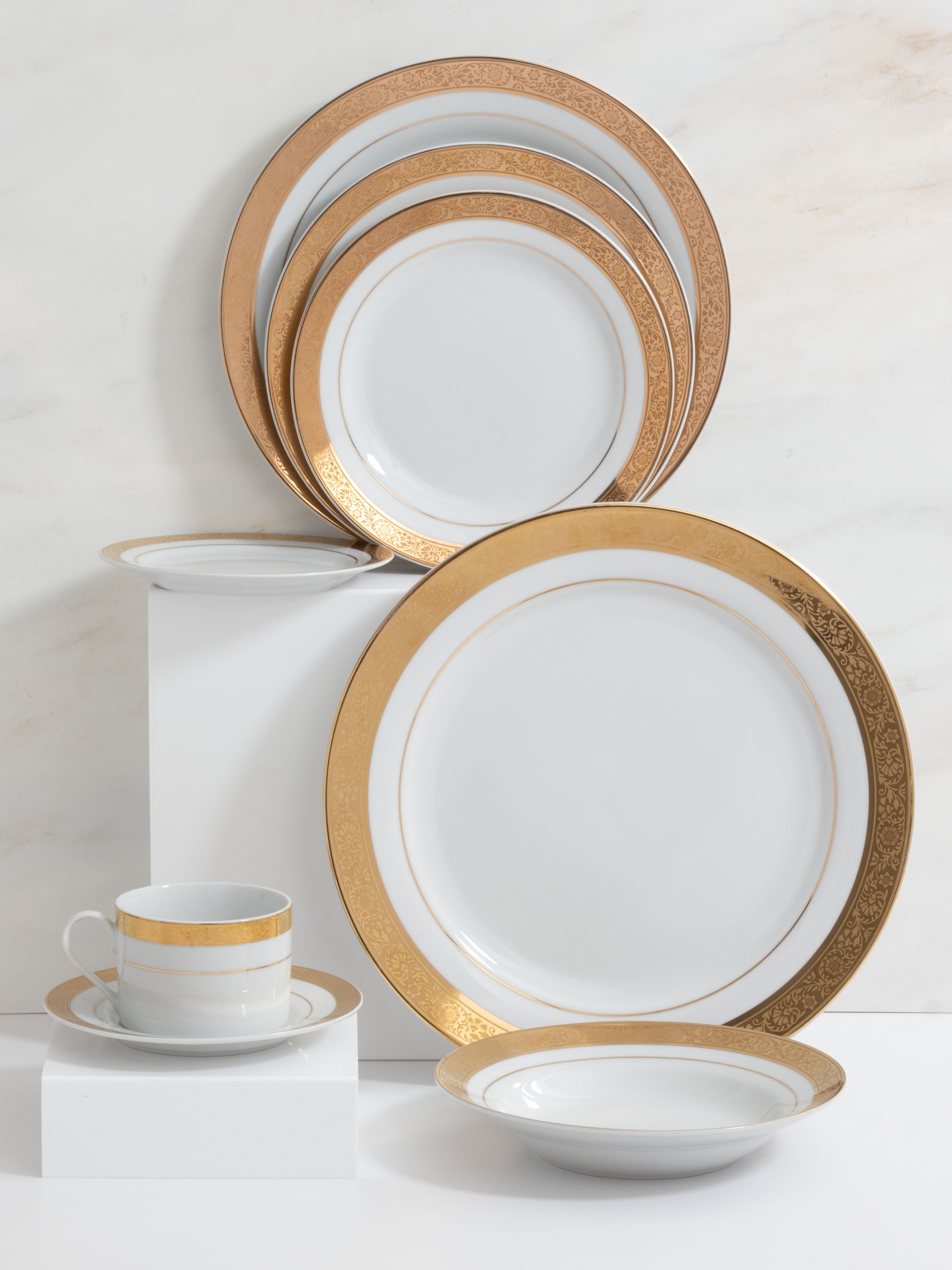 The Juliet collection pairs soft ivory with graceful gold detailing. A textured floral pattern and dual gold bands add depth while maintaining a classic, understated elegance.