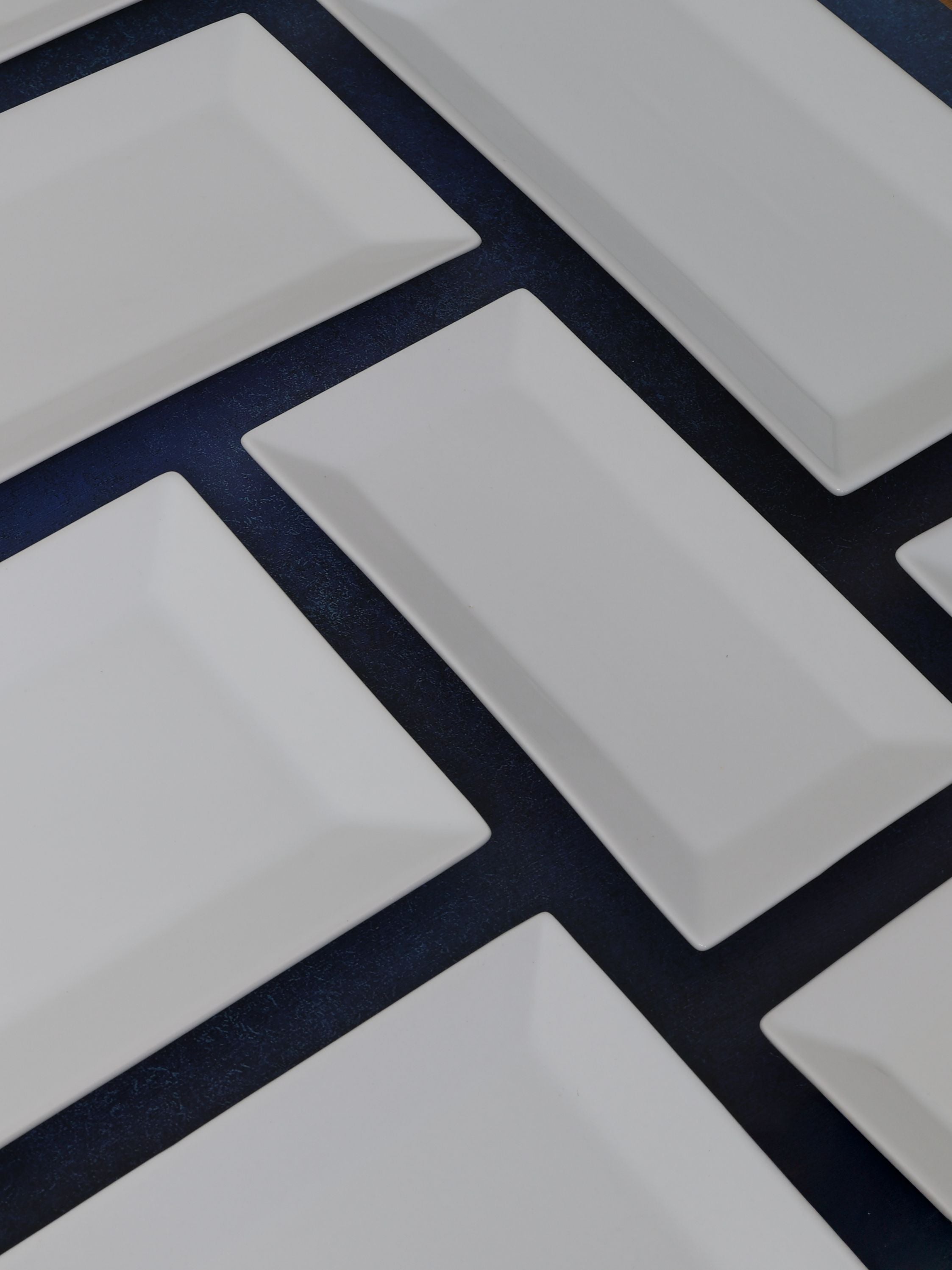 These rectangular white plates bring a clean, modern look to the table with sharp edges and smooth surfaces. Their elongated shape makes them especially suited for creative plating, offering a versatile backdrop that works equally well for casual dining or more refined presentations.