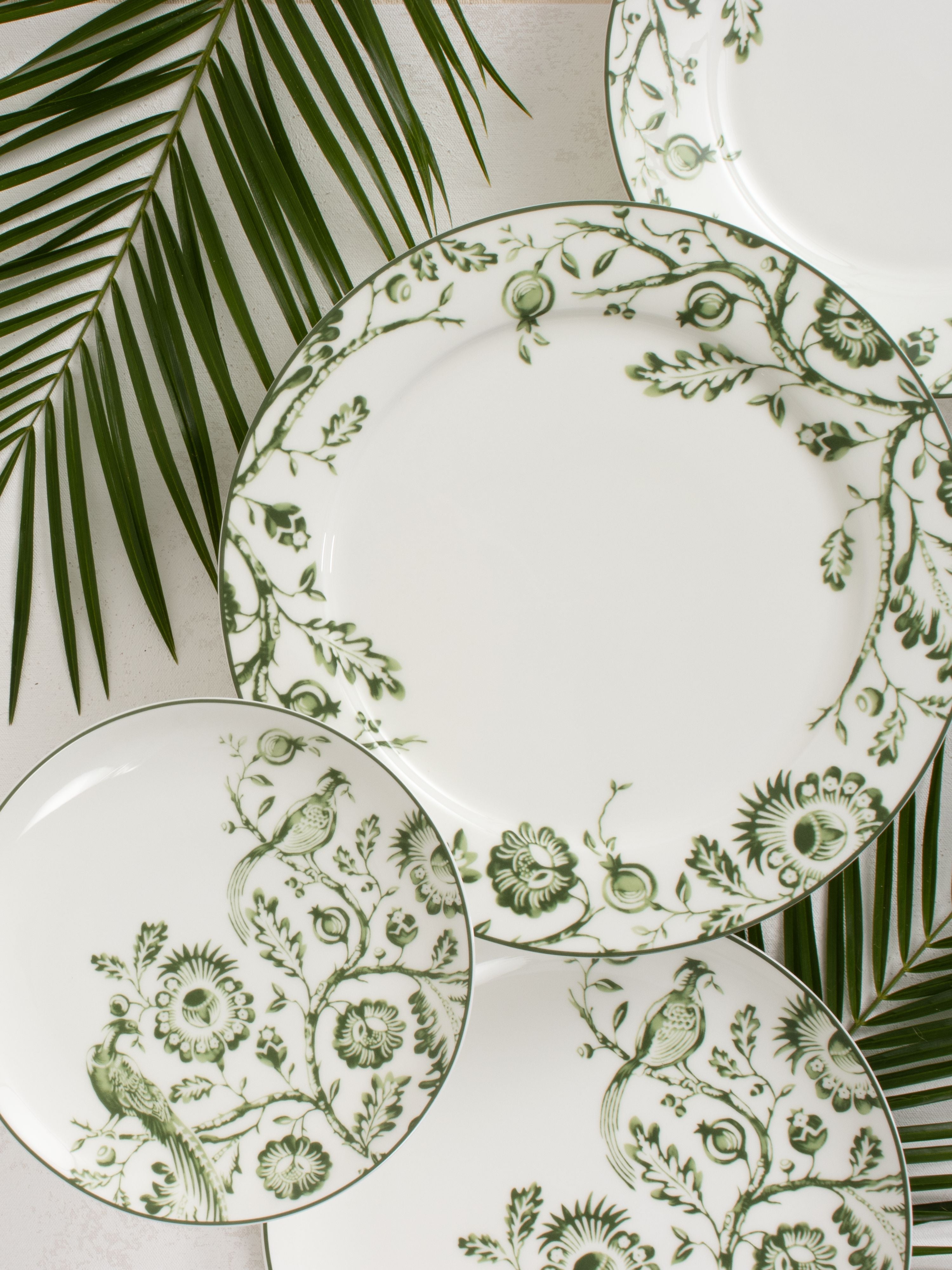 The Savannah Green collection brings timeless elegance to the table with its lush green floral and bird motifs set against a clean white background. The detailed artistry and flowing patterns of the design make it feel refined yet organic, perfect for occasions that call for a touch of nature-inspired sophistication.