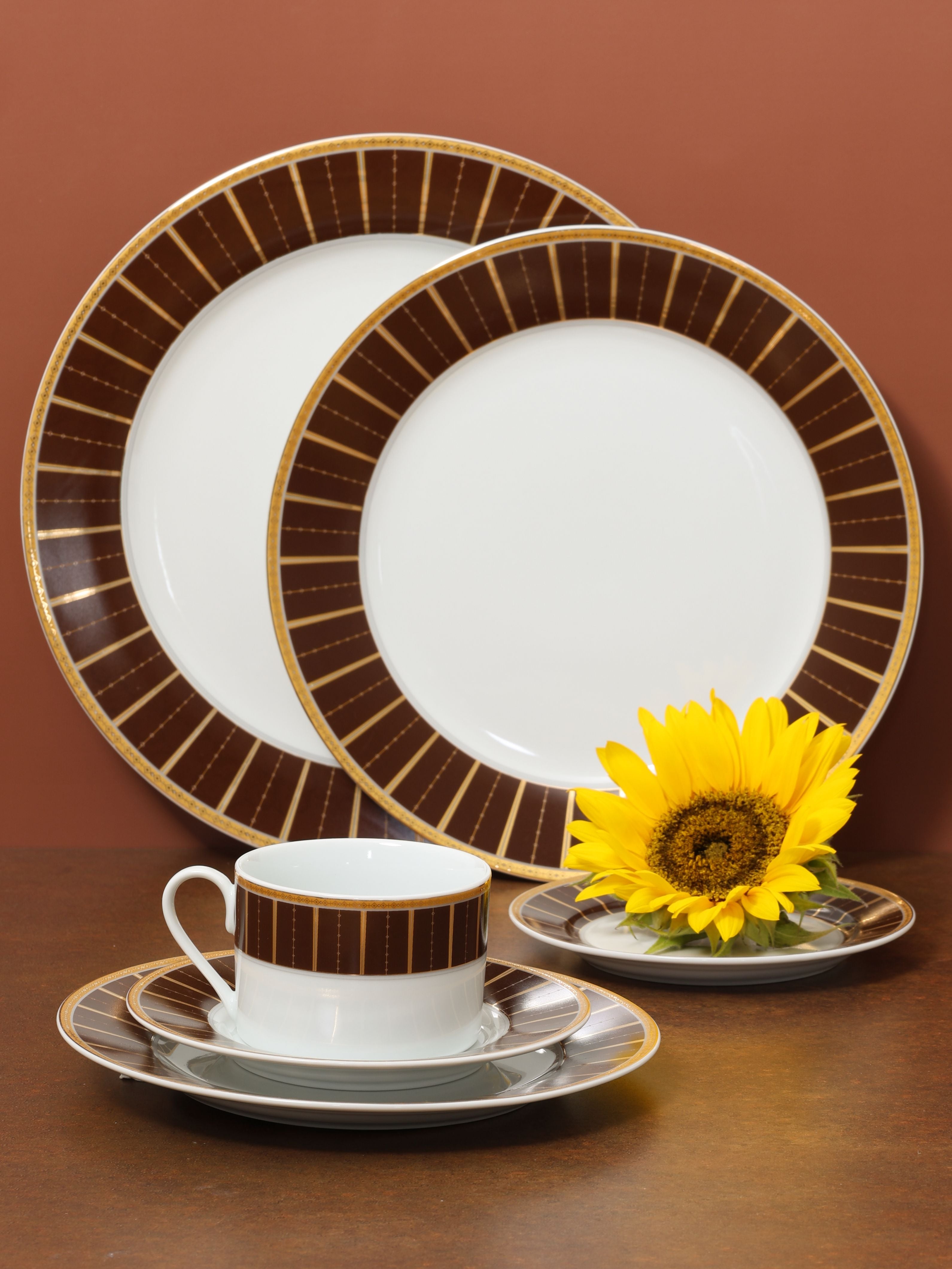 Rich and refined, the Tiffany collection makes a bold statement with its deep chocolate border accented by radiant gold detailing. The striking design brings warmth and elegance to the table, creating a luxurious atmosphere for dining. Perfect for sophisticated occasions, this collection blends timeless artistry with modern allure.