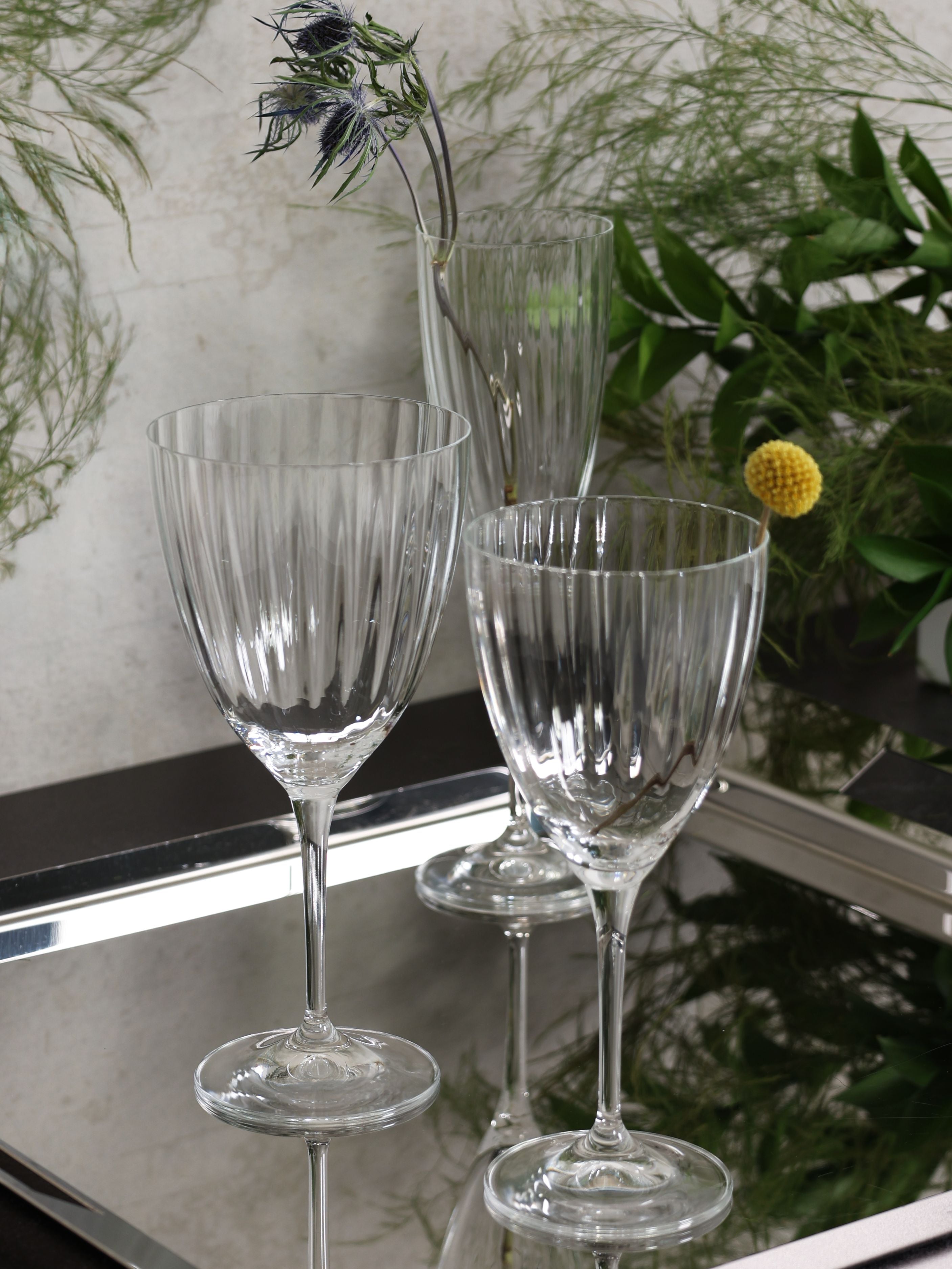 A slim, elongated stem lifts each piece in this optic-patterned glassware series, where subtle vertical ribbing adds a refined sense of movement. The wine, water, and champagne shapes create a cohesive tabletop story, bringing a graceful, airy profile to any setting.